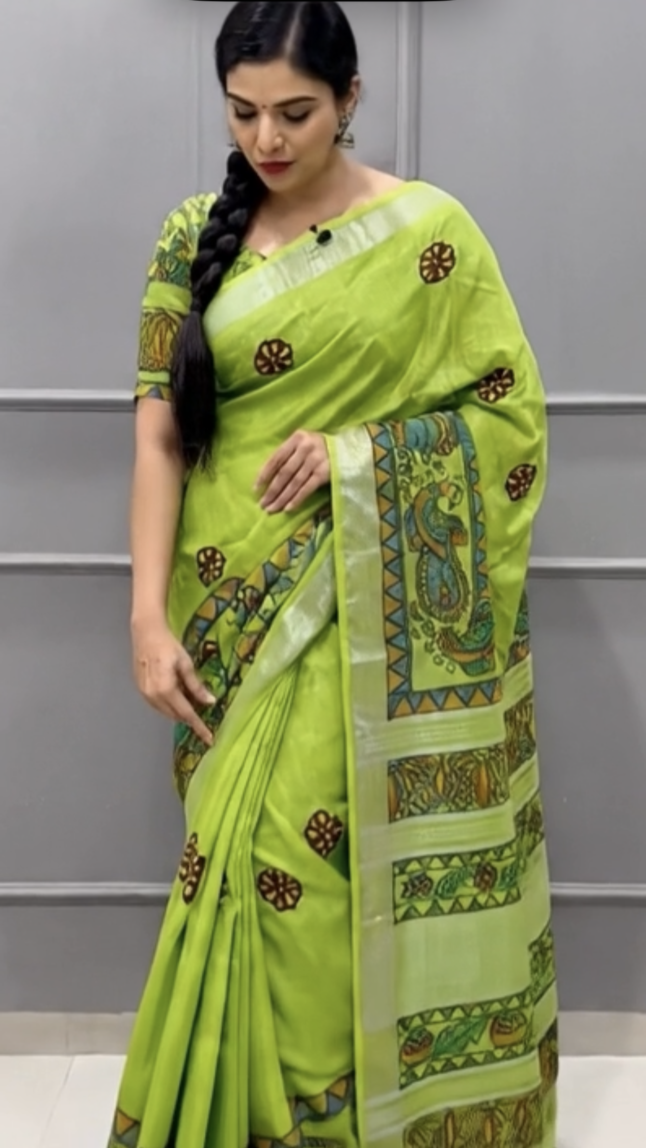 Parrot Green Linen Cotton Saree with Blouse - Peacock & Floral Motifs Hand Painted Madhubani Art